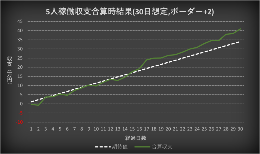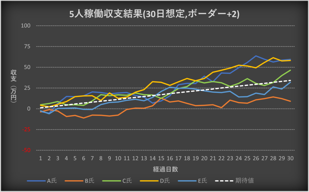 ※ボーダーラインに近づけば近づくほど期待値との差のパーセンテージが大きくなるのは期待値と収支が+-0に近づいていくことが要因となっているため、統計学的には健全な挙動を示しています。