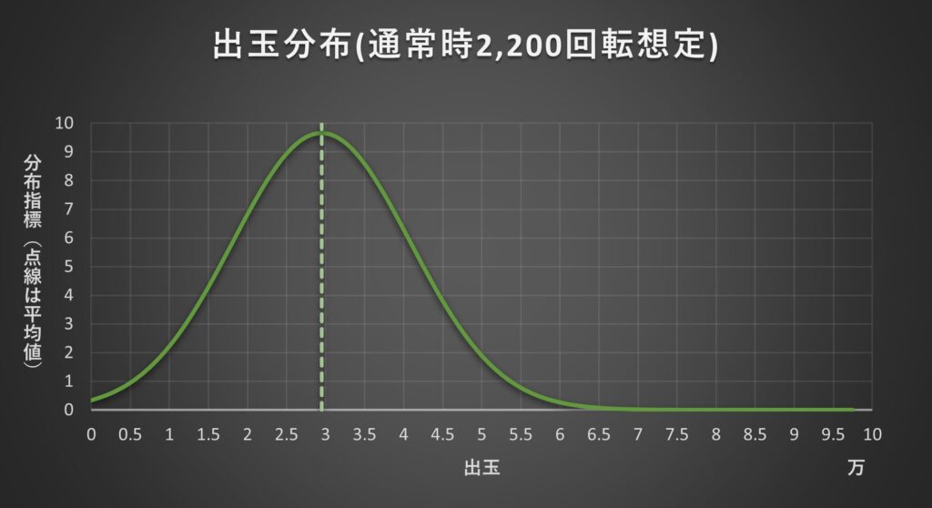 ・一日の払い出し出玉の分布です。縦軸の分布指標を基に他機種と出玉性能のバラつきを比較することができます。