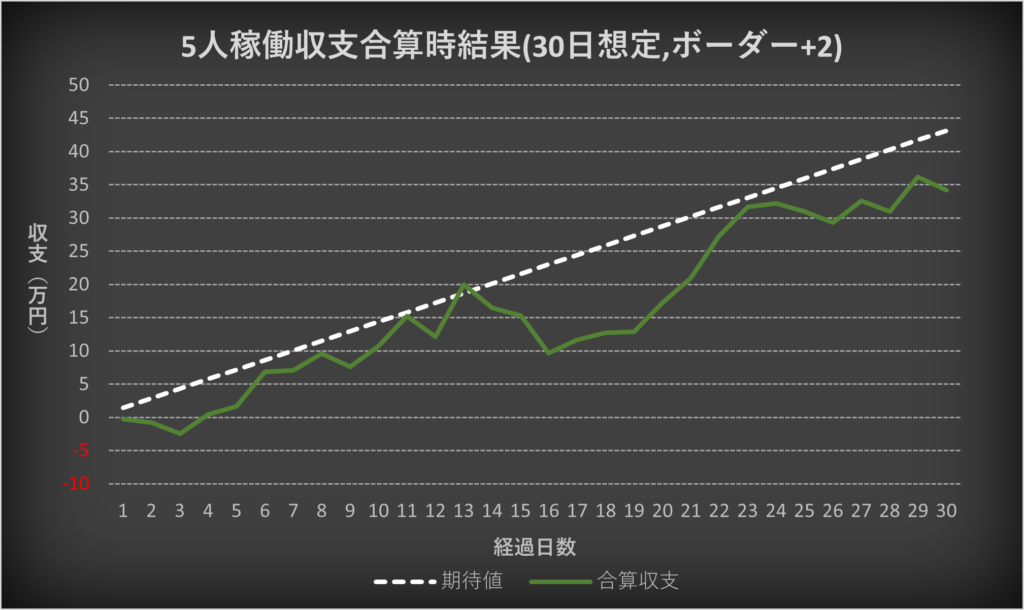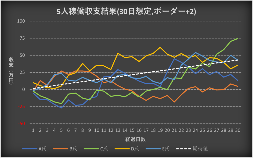 ※ボーダーラインに近づけば近づくほど期待値との差のパーセンテージが大きくなるのは期待値と収支が+-0に近づいていくことが要因となっているため、統計学的には健全な挙動を示しています。