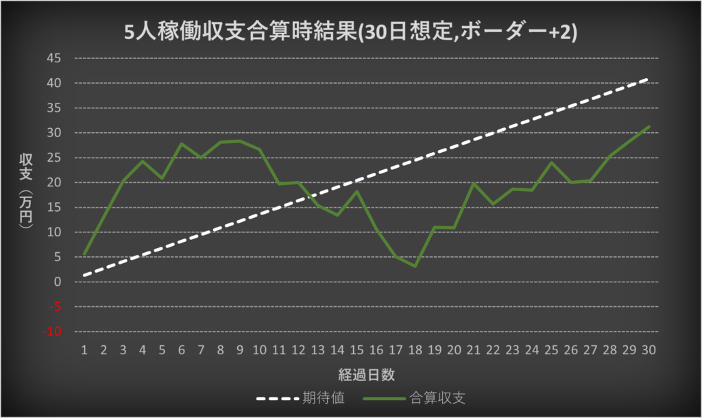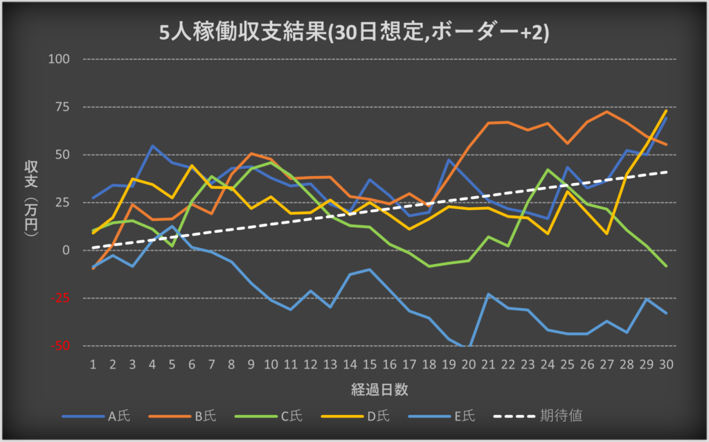 ※ボーダーラインに近づけば近づくほど期待値との差のパーセンテージが大きくなるのは期待値と収支が+-0に近づいていくことが要因となっているため、統計学的には健全な挙動を示しています。