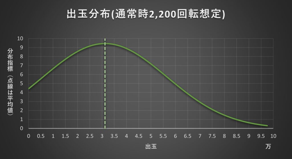 ・一日の払い出し出玉の分布です。縦軸の分布指標を基に他機種と出玉性能のバラつきを比較することができます。