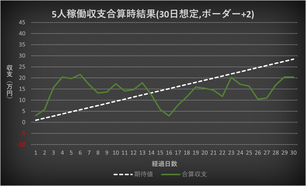 ※ボーダーラインに近づけば近づくほど期待値との差のパーセンテージが大きくなるのは期待値と収支が+-0に近づいていくことが要因となっているため、統計学的には健全な挙動を示しています。