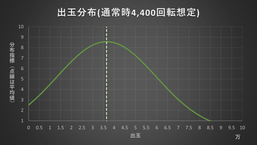 ・一日の払い出し出玉の分布です。縦軸の分布指標を基に他機種と出玉性能のバラつきを比較することができます。
