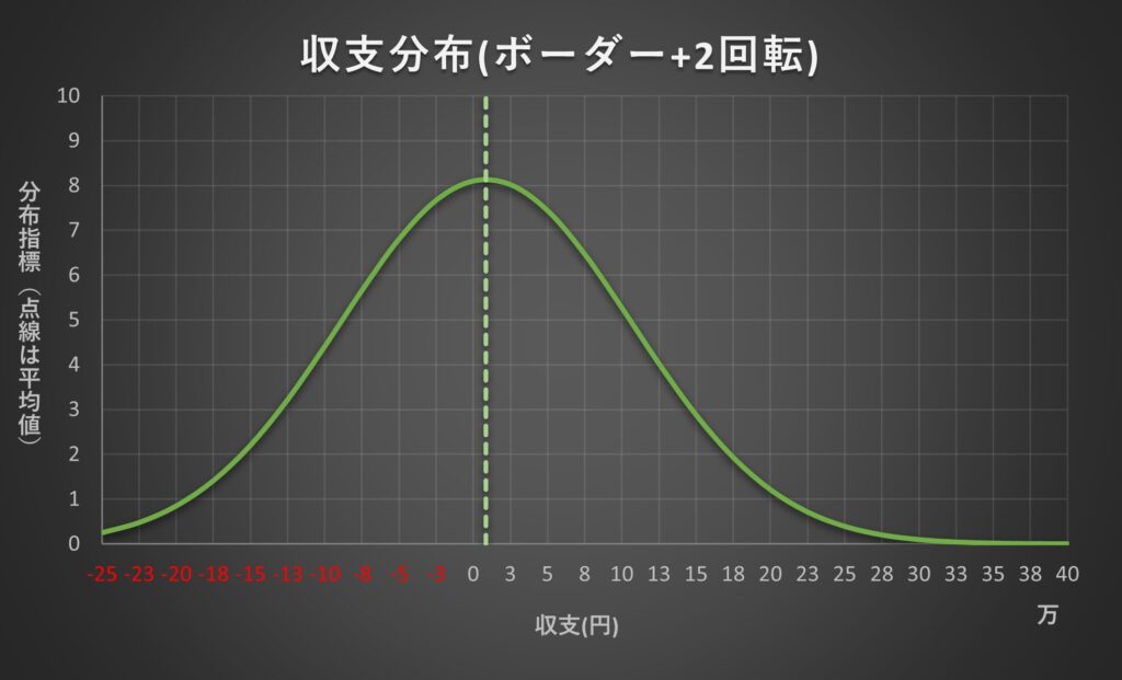 ・ボーダー+2回転時の一日辺りの収支分布になります。上記出玉分布同様収支の荒さを直感的に見ることができます。