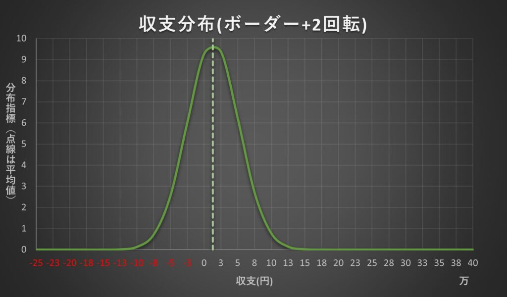 ・ボーダー+2回転時の一日辺りの収支分布になります。上記出玉分布同様収支の荒さを直感的に見ることができます。