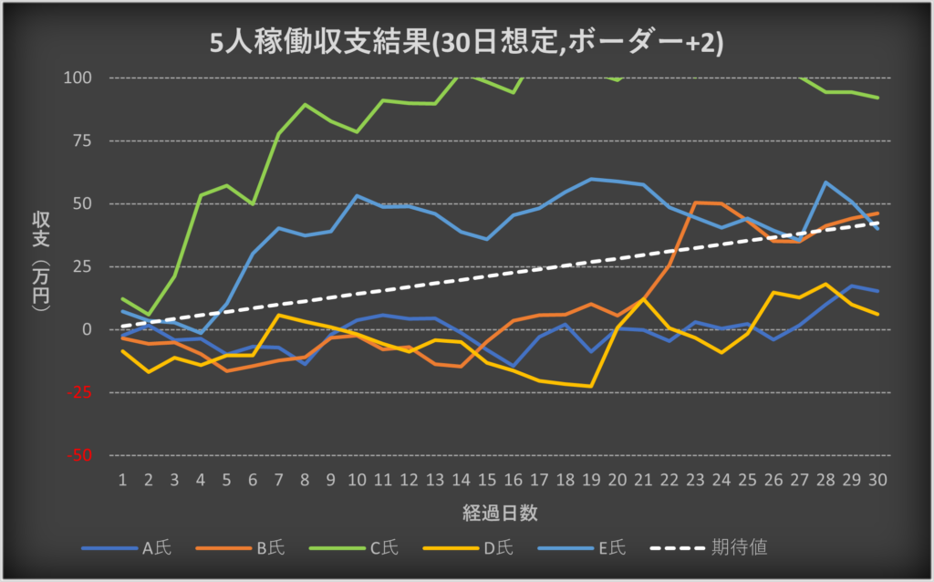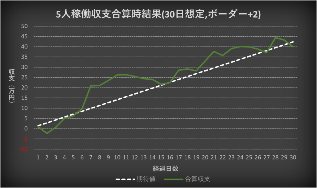 ※ボーダーラインに近づけば近づくほど期待値との差のパーセンテージが大きくなるのは期待値と収支が+-0に近づいていくことが要因となっているため、統計学的には健全な挙動を示しています。