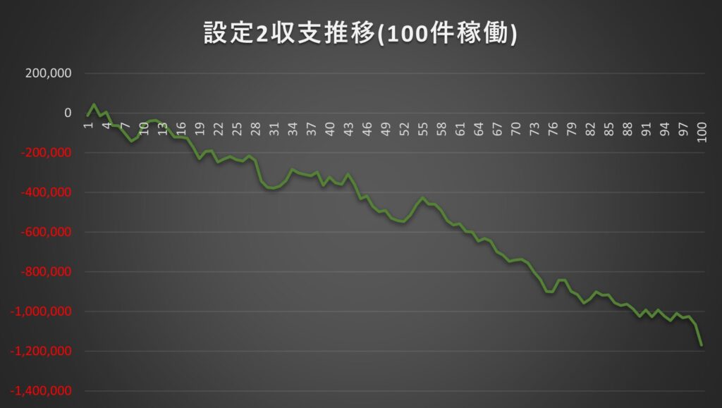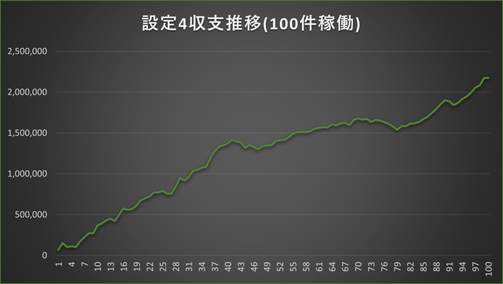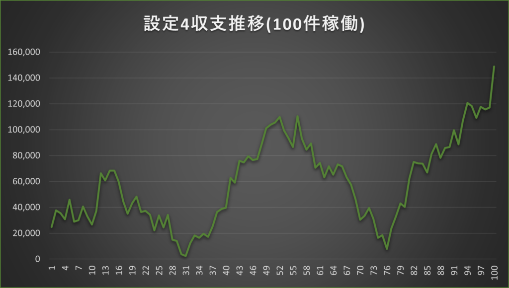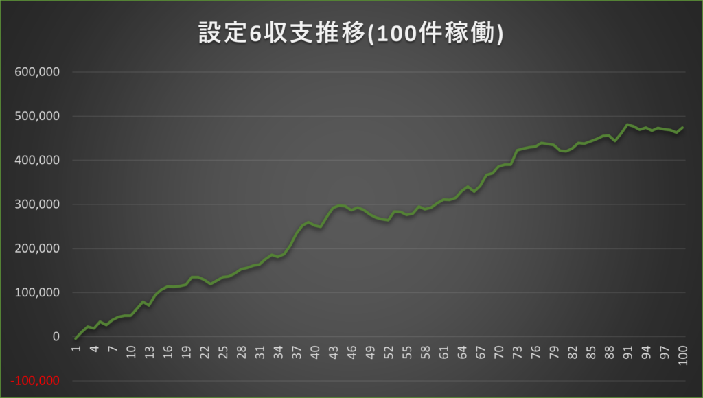 ※収支の単位は全て円です。また、グラフはあくまでも対象とした区間の結果であり、対象箇所を変えるとある程度結果は変動するため、あくまでもおおまかな収支の安定具合を直感的に図るための参考画像として受け取ってください。