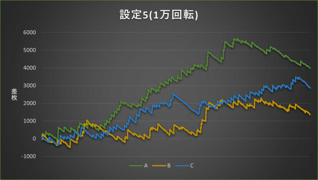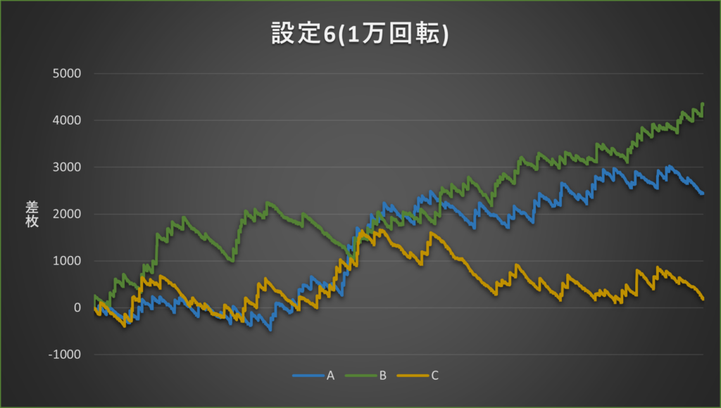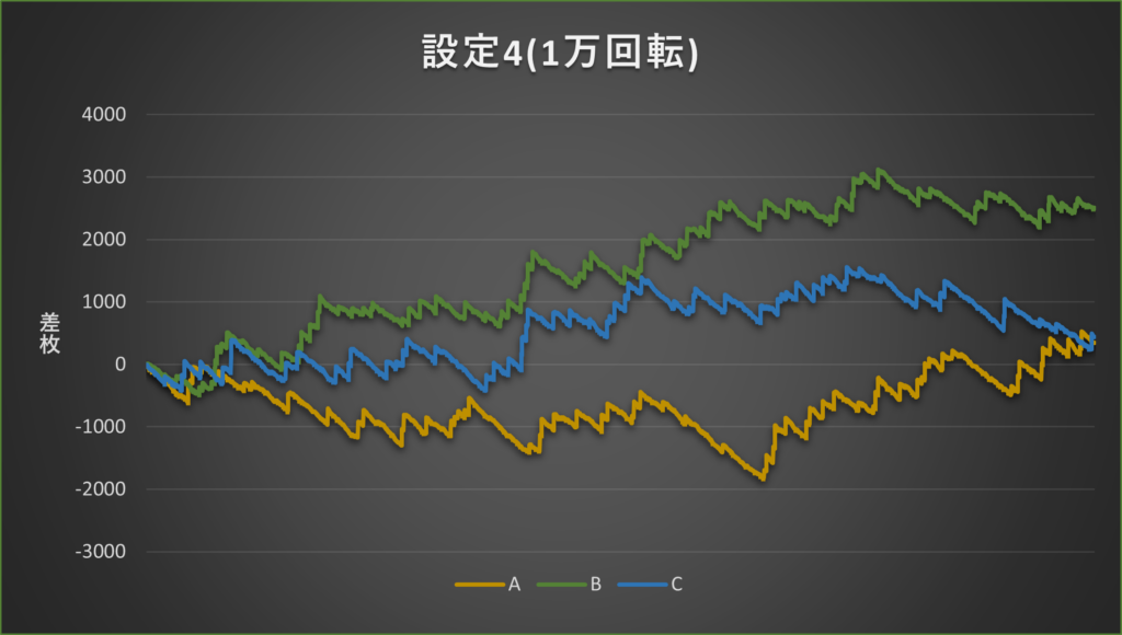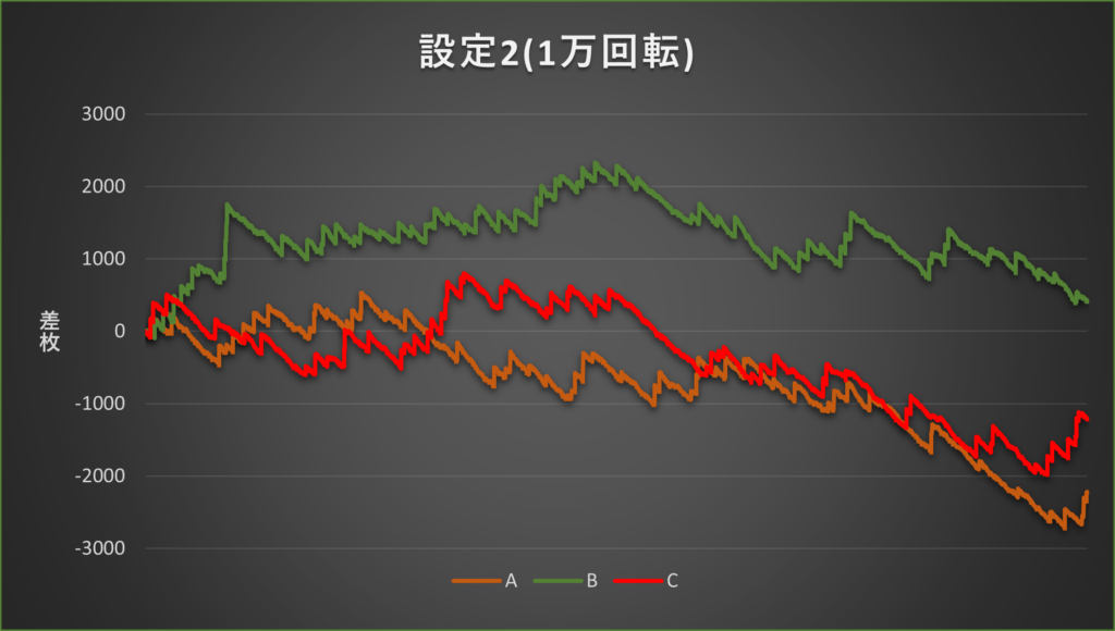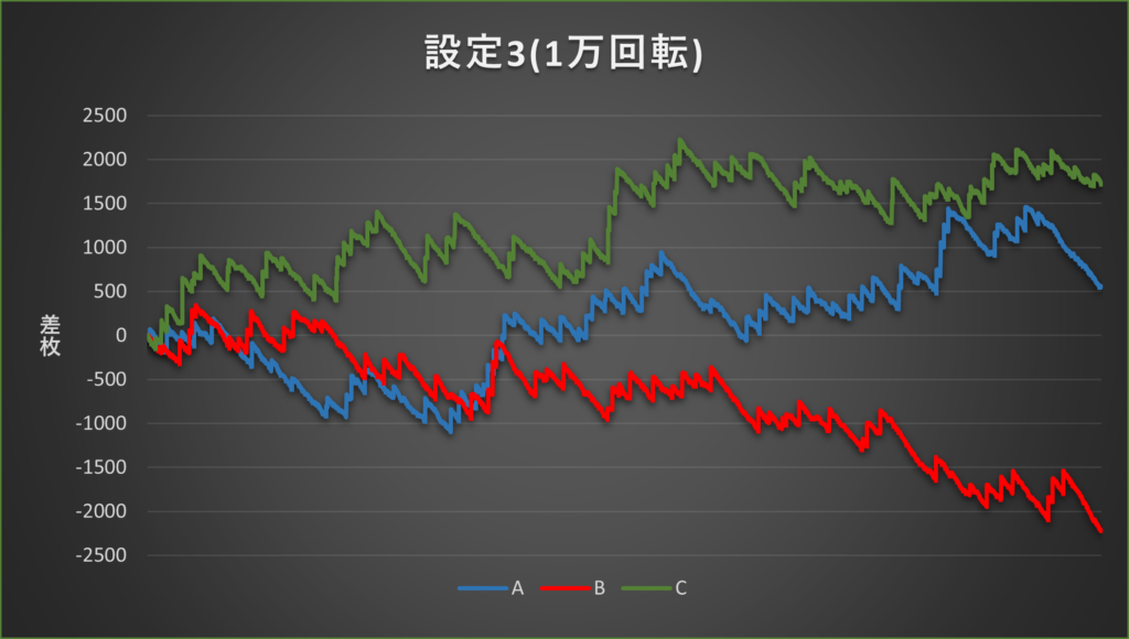 こちらで掲載されているグラフは各設定ごとに1万回転回した時にどのようなグラフを描くのかをシミュレートしたものです。