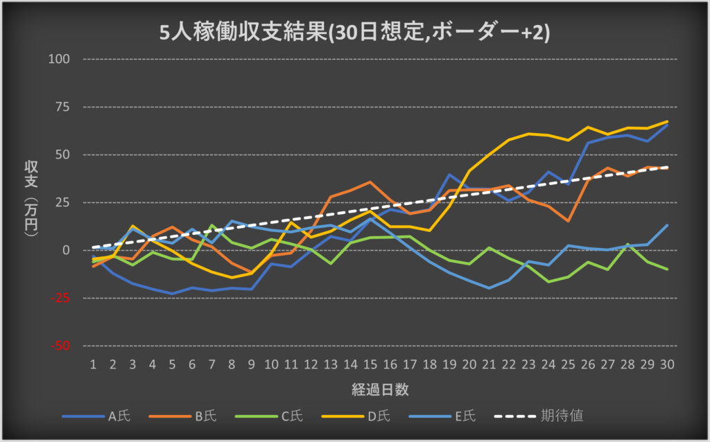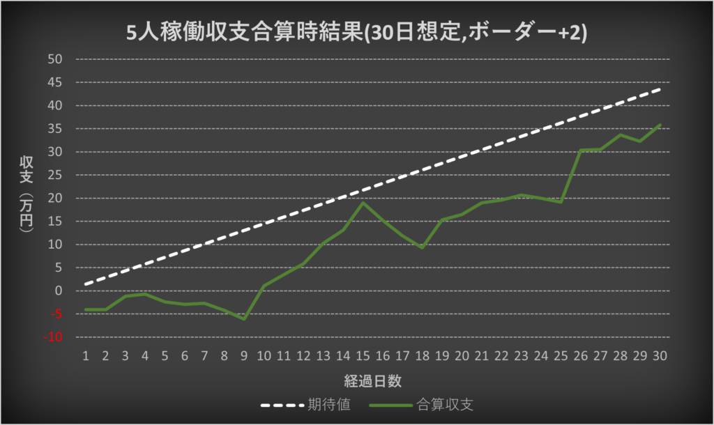 ※ボーダーラインに近づけば近づくほど期待値との差のパーセンテージが大きくなるのは期待値と収支が+-0に近づいていくことが要因となっているため、統計学的には健全な挙動を示しています。