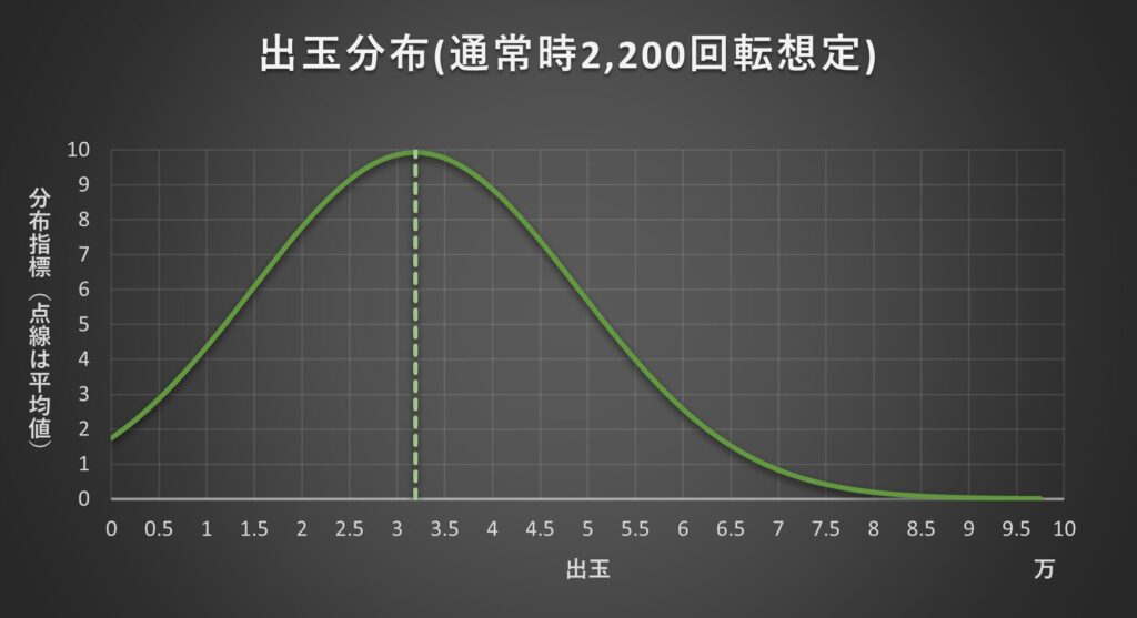 ・一日の払い出し出玉の分布です。縦軸の分布指標を基に他機種と出玉性能のバラつきを比較することができます。