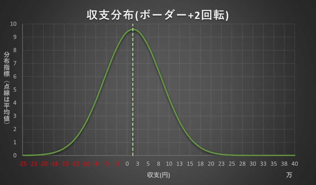 ・ボーダー+2回転時の一日辺りの収支分布になります。上記出玉分布同様収支の荒さを直感的に見ることができます。