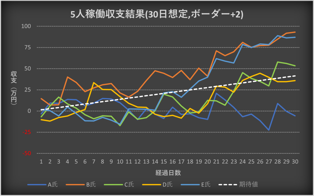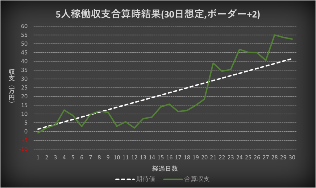 ※ボーダーラインに近づけば近づくほど期待値との差のパーセンテージが大きくなるのは期待値と収支が+-0に近づいていくことが要因となっているため、統計学的には健全な挙動を示しています。