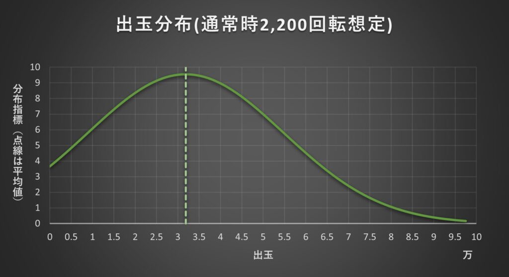 ・一日の払い出し出玉の分布です。縦軸の分布指標を基に他機種と出玉性能のバラつきを比較することができます。
