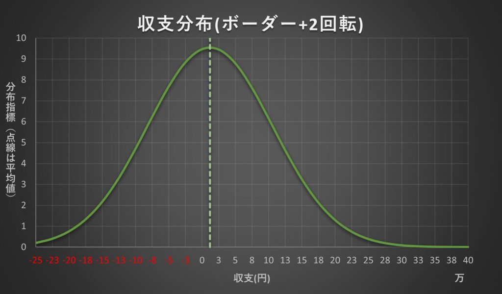 ・ボーダー+2回転時の一日辺りの収支分布になります。上記出玉分布同様収支の荒さを直感的に見ることができます。
