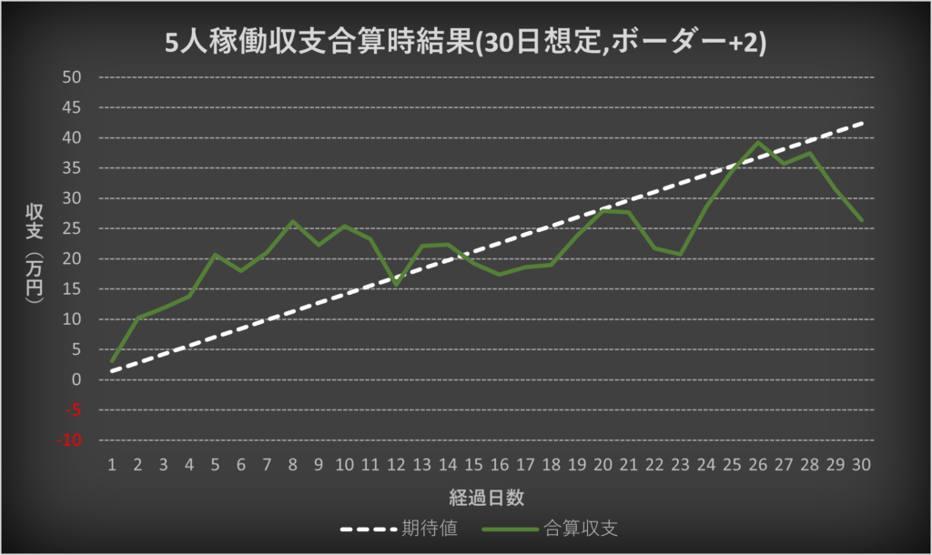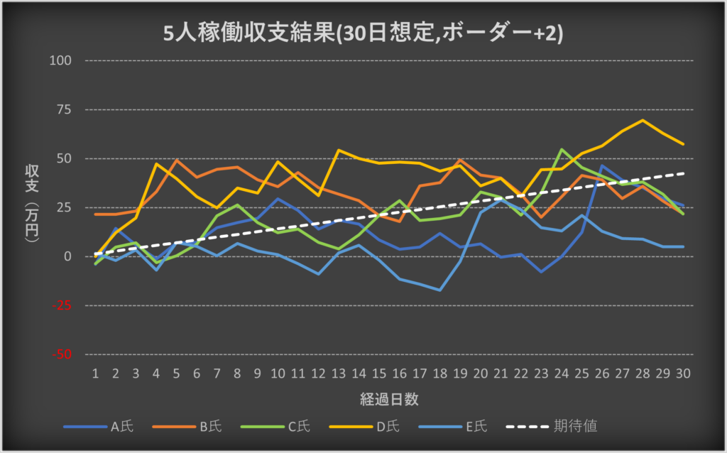 ※ボーダーラインに近づけば近づくほど期待値との差のパーセンテージが大きくなるのは期待値と収支が+-0に近づいていくことが要因となっているため、統計学的には健全な挙動を示しています。